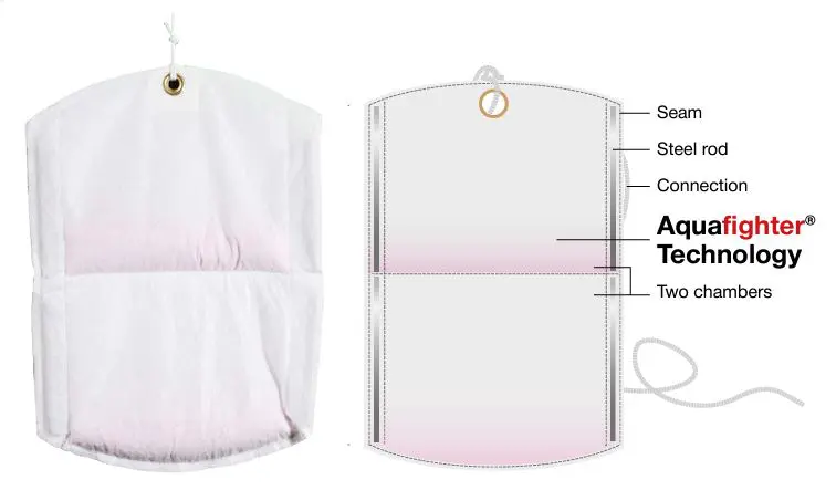 • Remove Aquafighter from the sealed bag and disperse the powder evenly throughout each chamber of the fabric pouch.