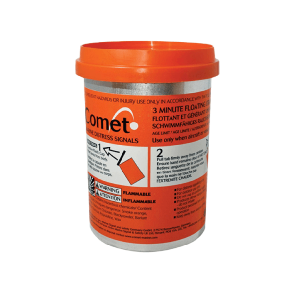 The NEW Comet Smoke Signal Orange is a small and compact distress signal for daylight use only, designed for stowage in liferafts. Signal for position marking during rescue operations. Indicates wind direction .Safe to use on oil or petrol covered water. Conforming to SOLAS 74/88 as amended . Two signals are required carriage in SOLAS liferafts and lifeboats. Two are supplied in RORC and Offshore leisure kits. To use: Peel off top cap, pull plastic tab sharply away from body. A 2 second delay allows time to throw the canister downwind into the water.